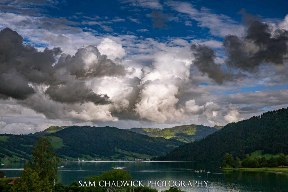A small fishing boat is tied up to the jetty at the village of Iseltwald in Lake Brienz